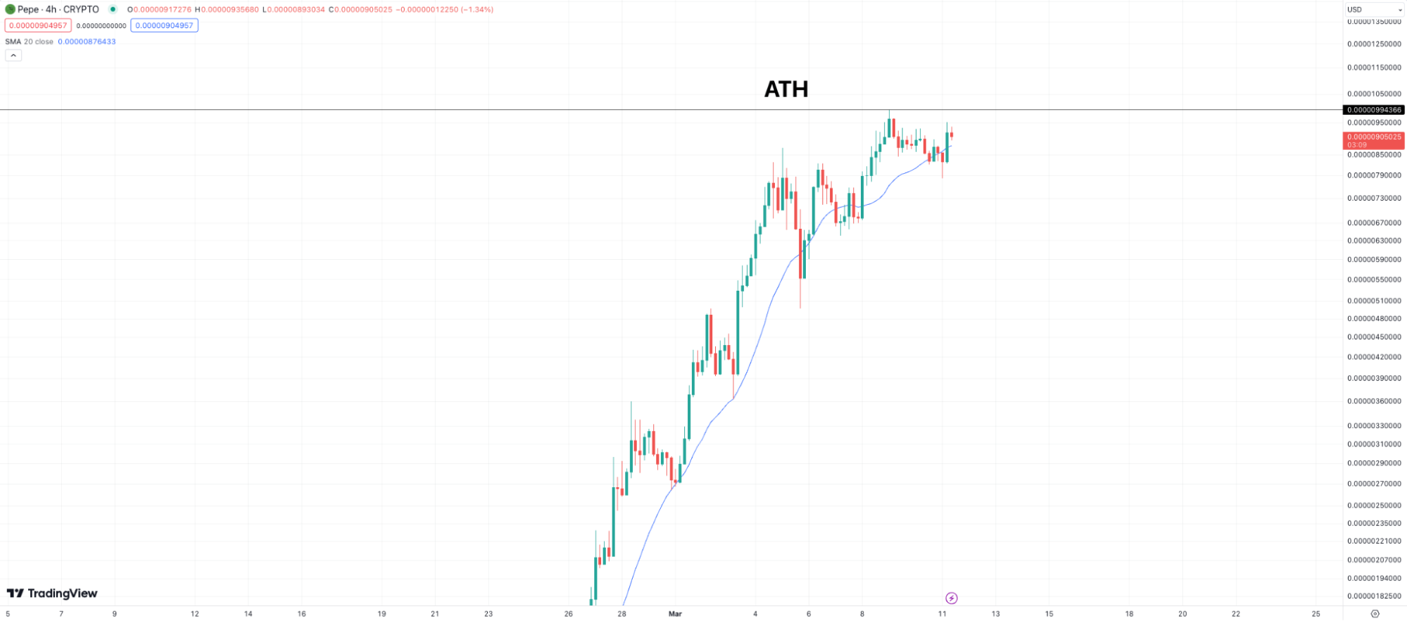 PEPE has rebounded aggressively, surging 15% in the past 12 hours after a weekend dip. As of the current writing, PEPE is testing the $0.0000090 level, displaying renewed strength.