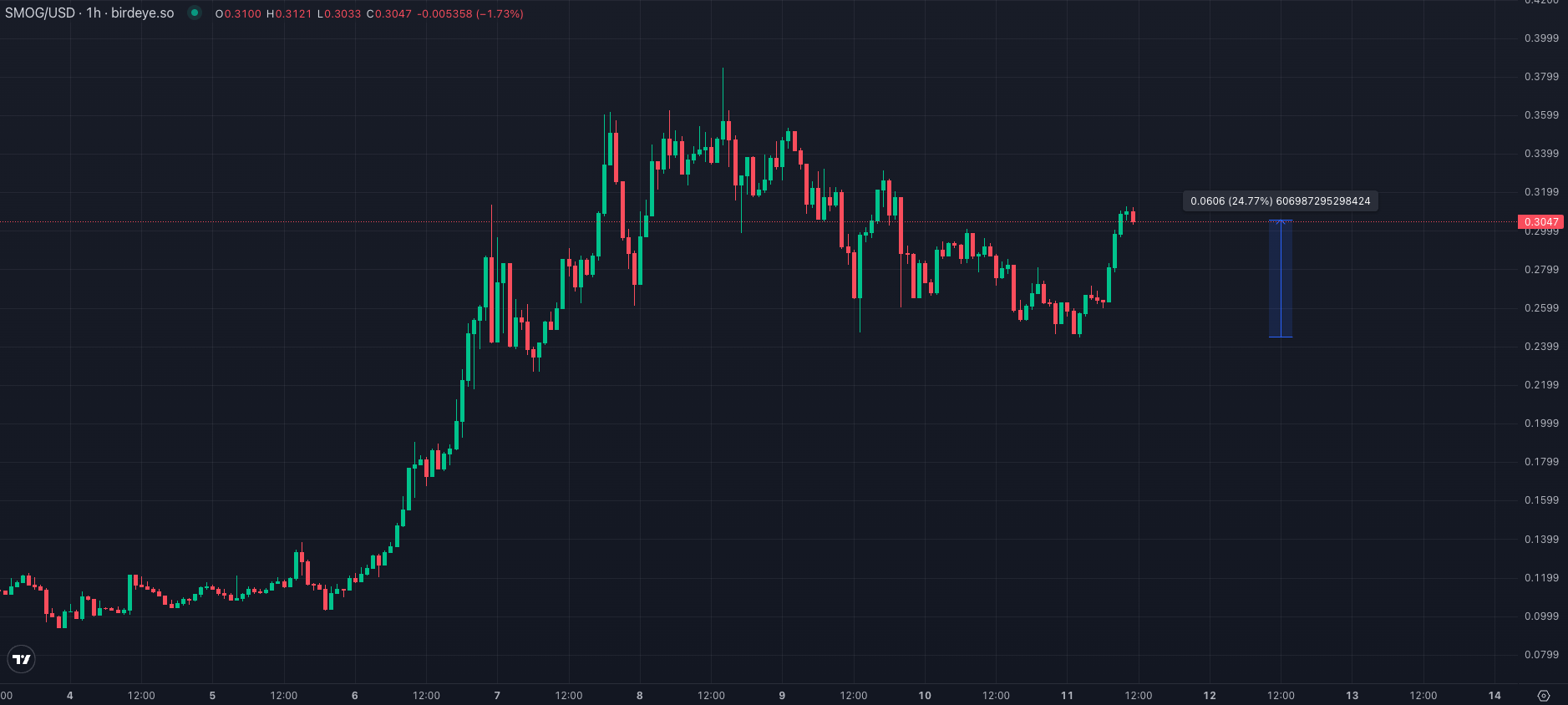 With a 24% surge in the past 12 hours, SMOG is currently trading at $0.306 per token, showcasing resilience after a brief consolidation period from its Friday all-time high.