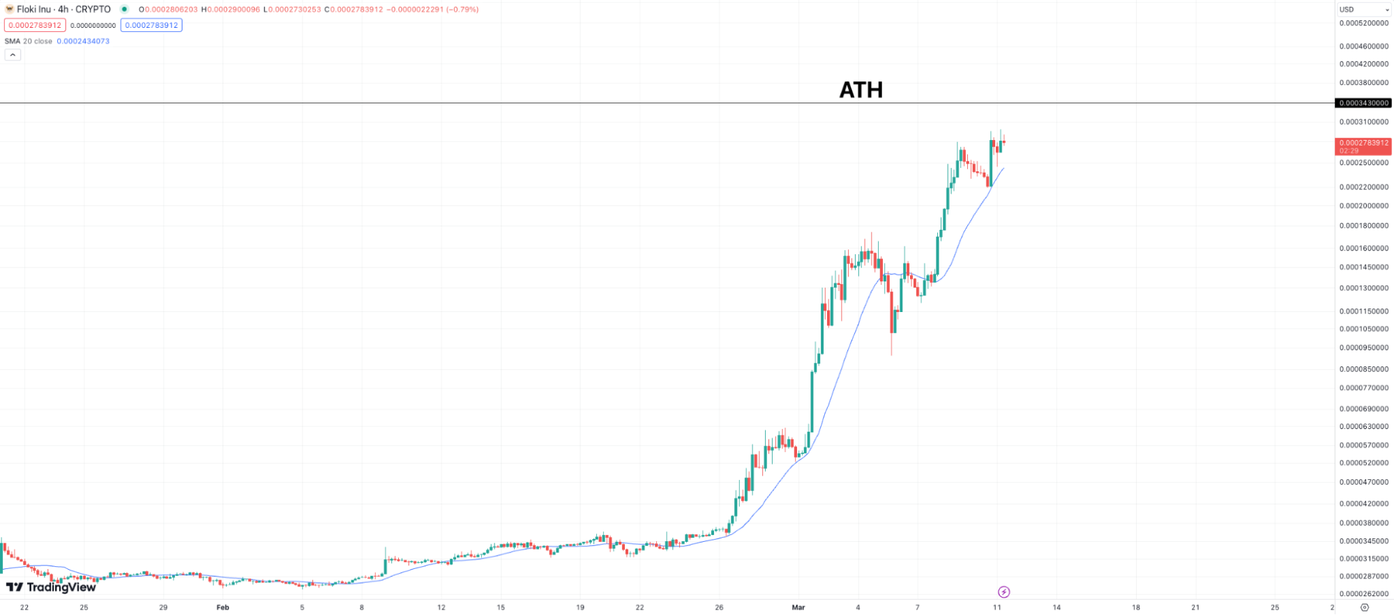 With five consecutive daily closes in the green, FLOKI has surged over 28% in the past 24 hours alone, bringing it within 18% of its previous all-time high in November 2021.