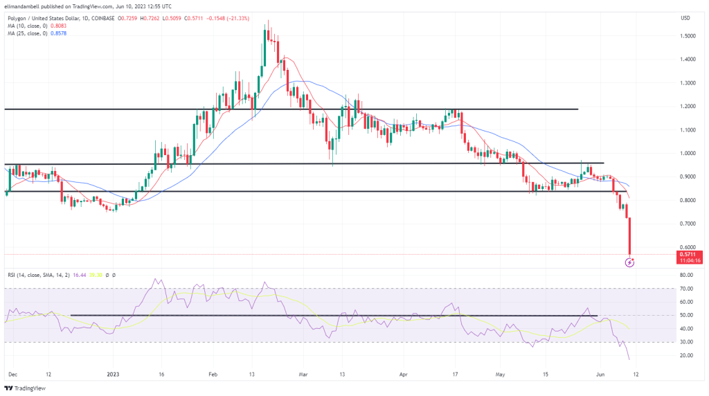 MATIC/USD sank to a bottom at $0.5605 on Saturday, as prices dropped by nearly 30% from yesterday’s high.