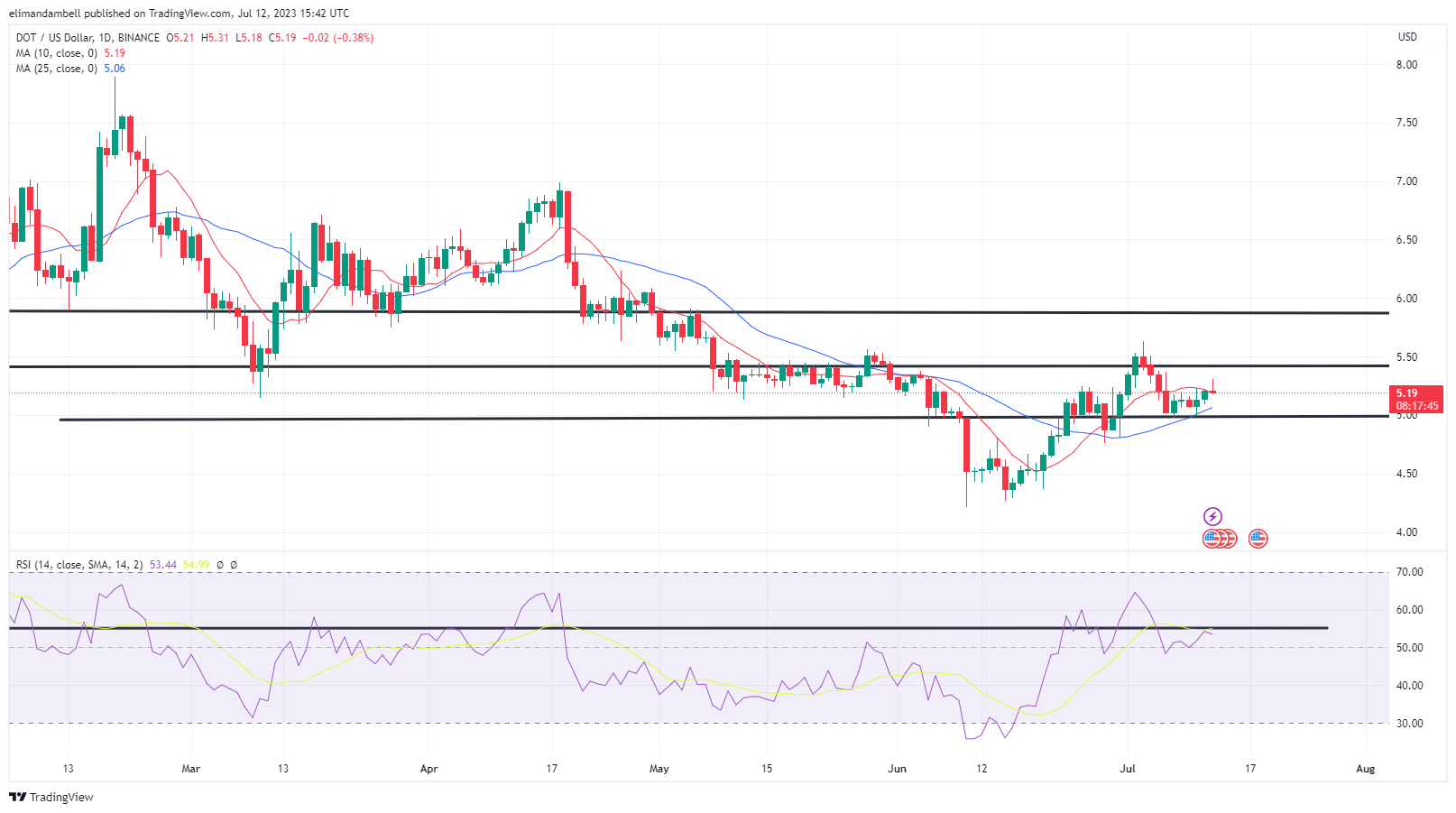 After falling to a low at $5.13 on Tuesday, DOT/USD jumped to an intraday high of $5.30 earlier today.