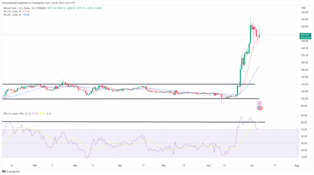 Earlier gains have now been erased, with BCH falling to a current reading at $279.71 as of writing.