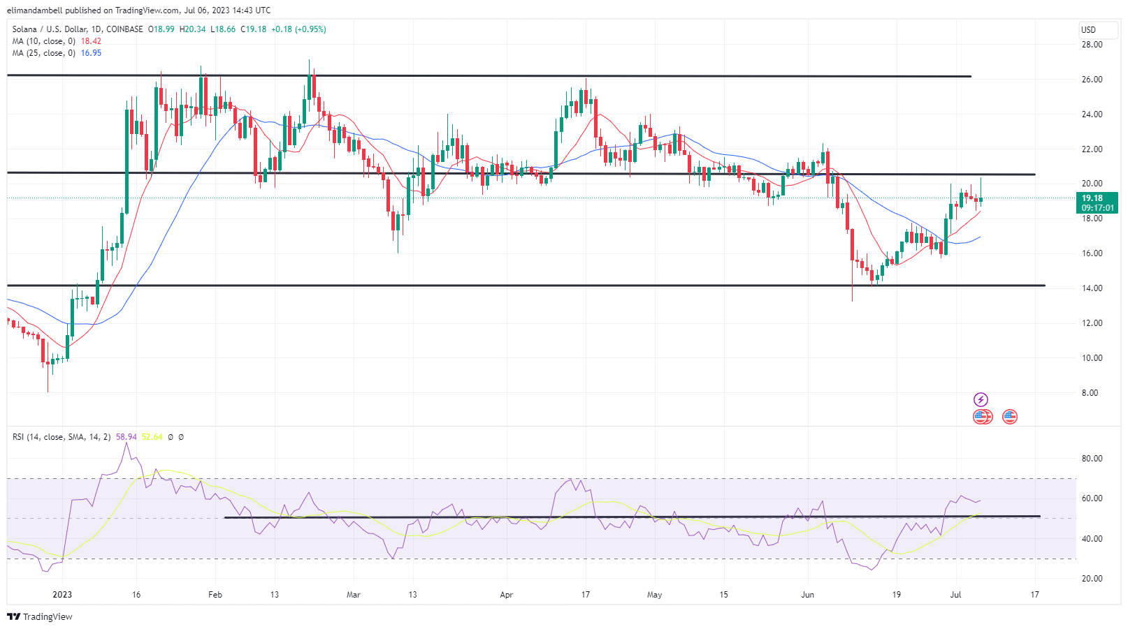 Solana ( SOL) moved past the $20.00 level earlier in the day, hitting a one-month high in the process.
