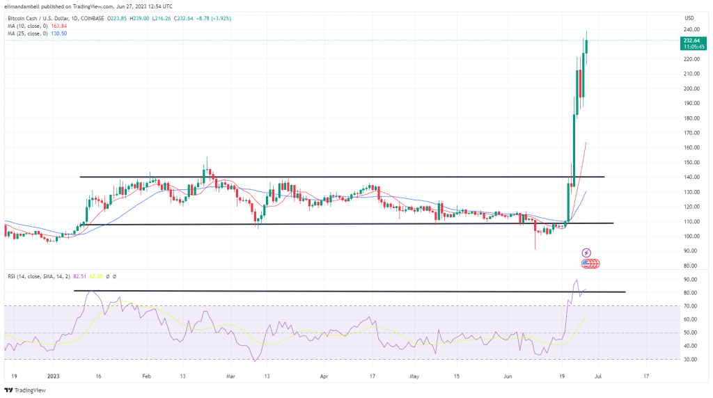 Following a low of $197.30 to start the week, BCH/USD raced to an intraday peak of $236.64 earlier in the day.