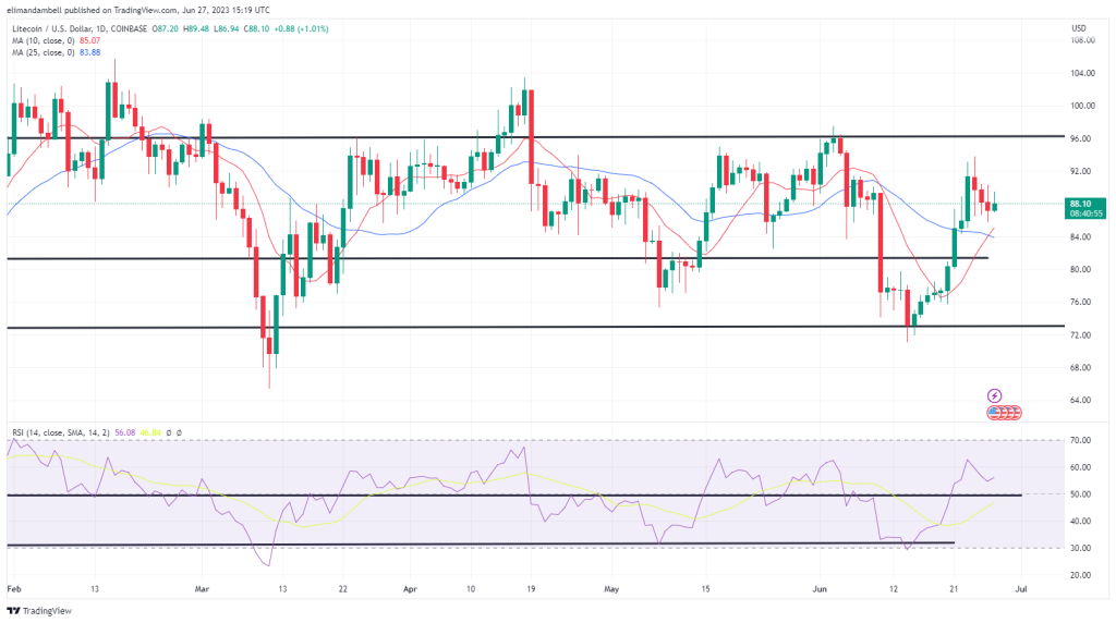 LTC/USD snapped a three-day losing streak on Tuesday, climbing to a peak of $89.90 earlier in the day.