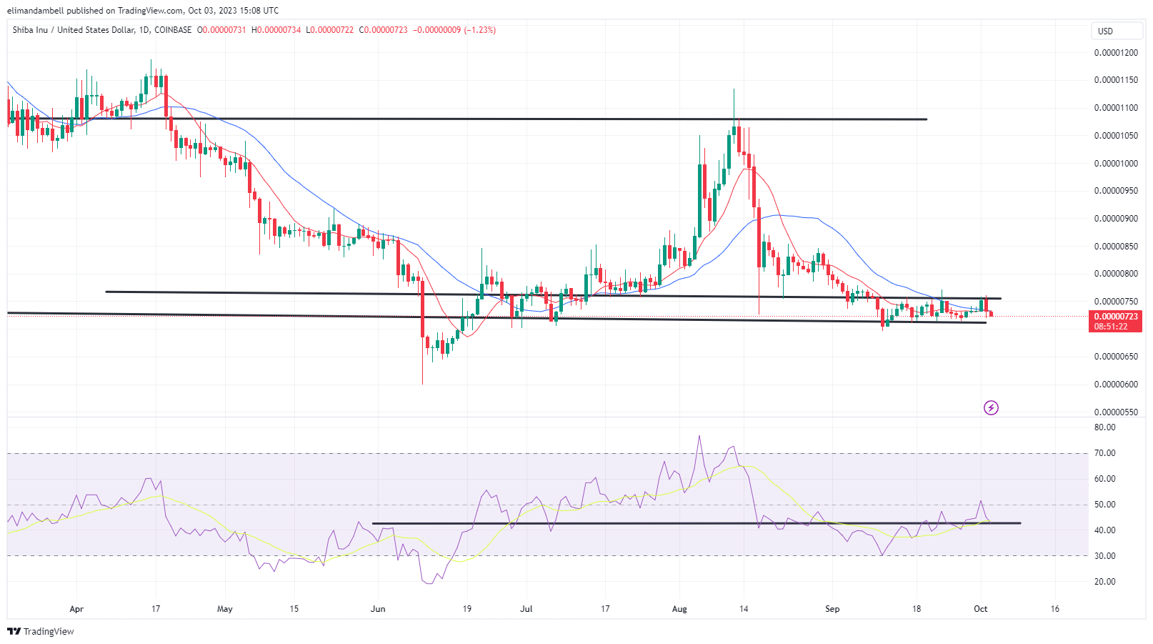 Whilst SHIB has not hit this point yet, the RSI has collided with a floor of its own at the 43.00 mark.
