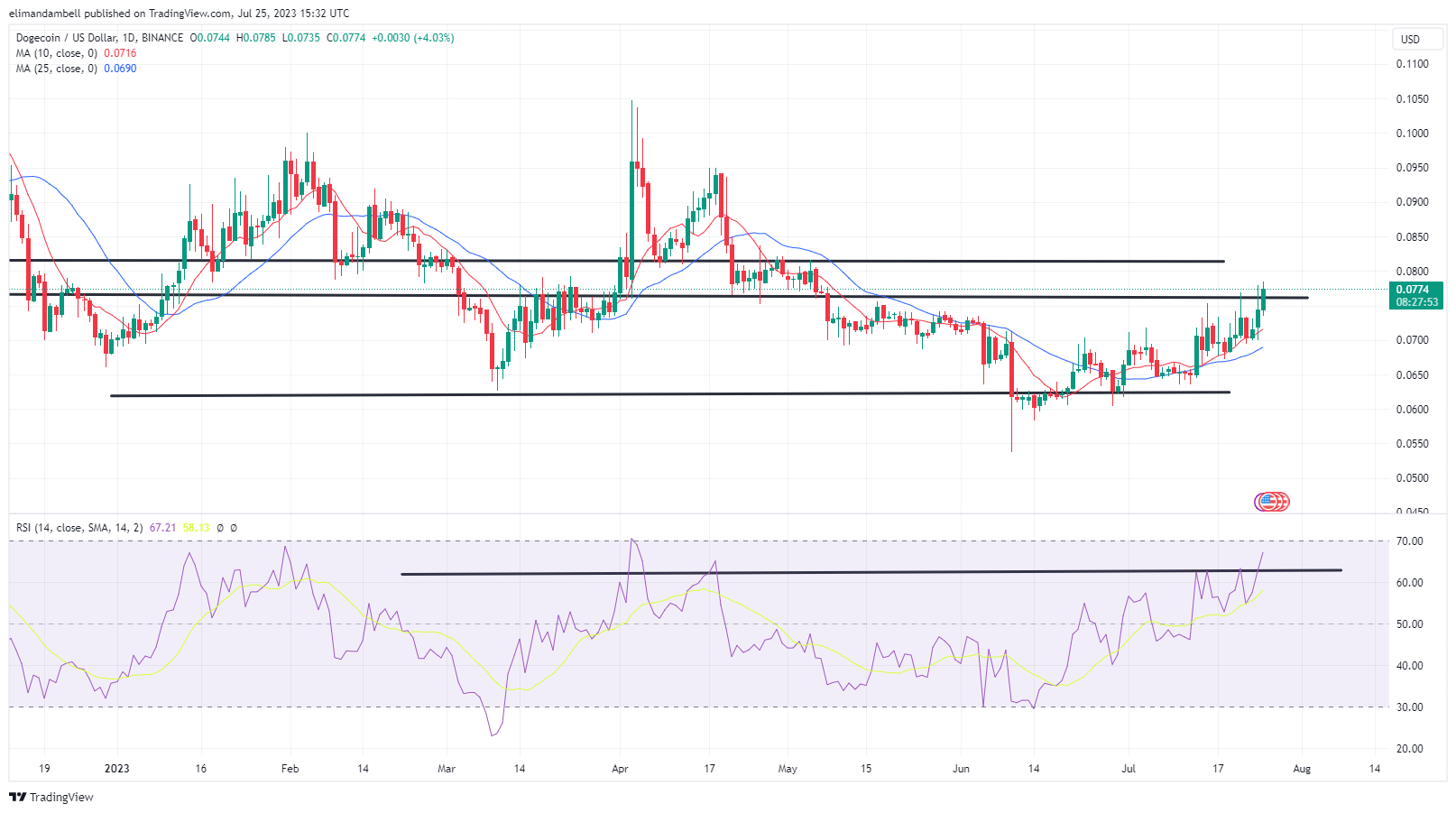 This resulted in the meme coin climbing to its strongest point since May 6, which is the last time price was above $0.08000.