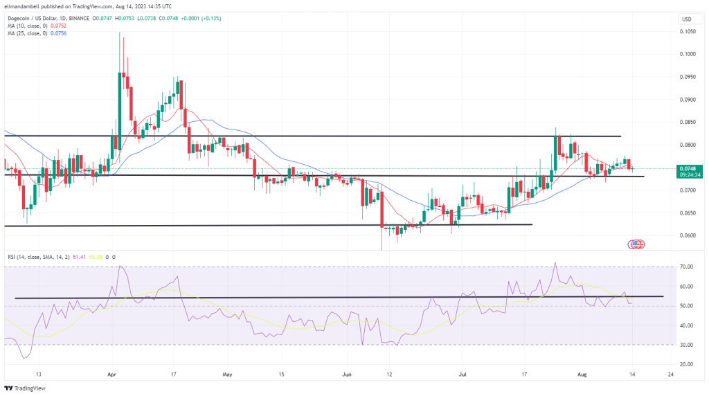 DOGE/USD fell to a low of $0.07409 to start the week, following an earlier high of $0.07615 the day prior.