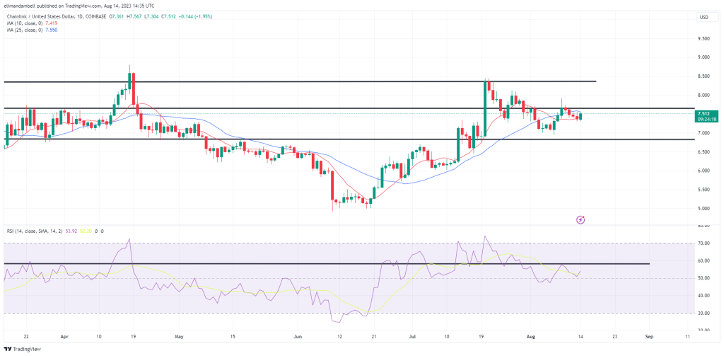At the time of writing, LINK is tracking at $7.49.