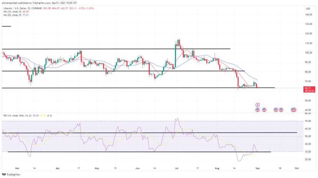 The move resulted in litecoin falling below a support point at $63.50, with bulls unable to prevent this breakout.