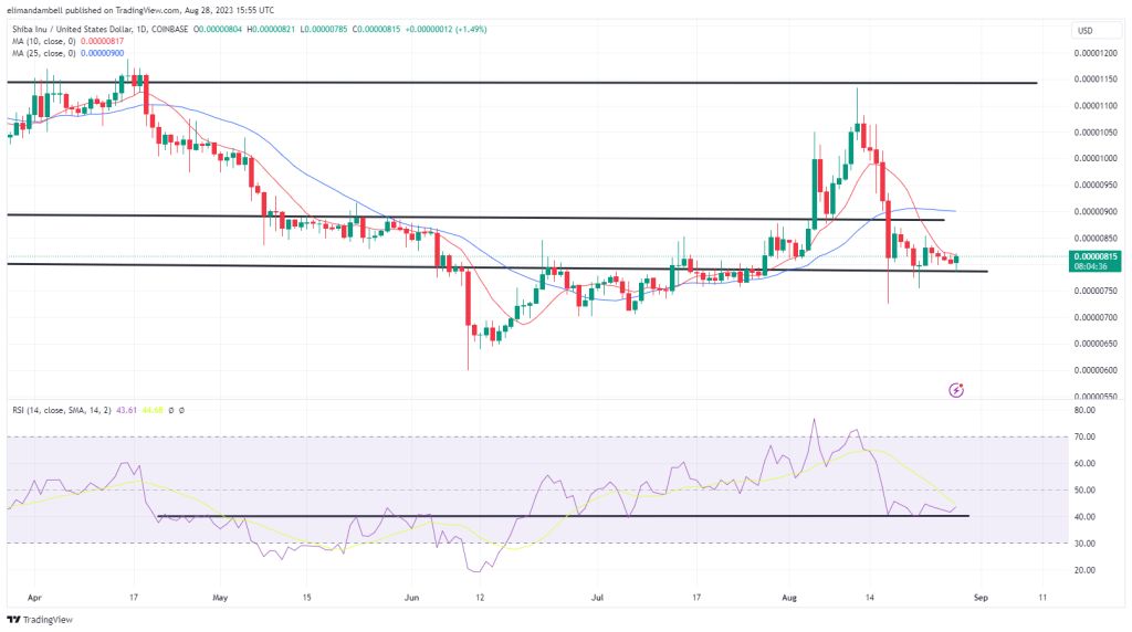 SHIB/USD fell to a bottom of $0.000007911 earlier in the day, following a high of $0.000008118 the day prior.