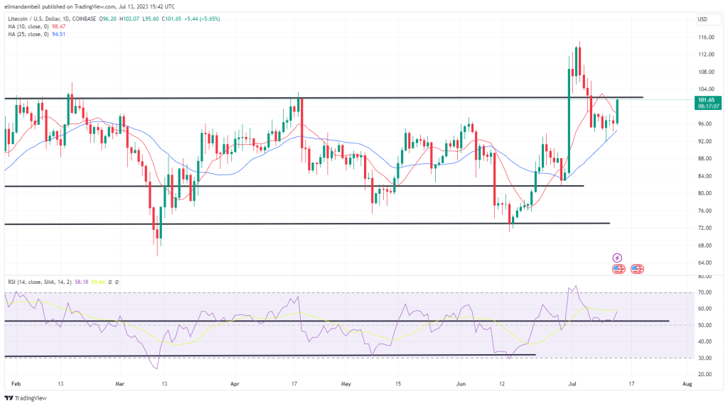 Following a low of $94.79 on Wednesday, LTC/USD raced to an intraday peak at $101.45 earlier in the day.