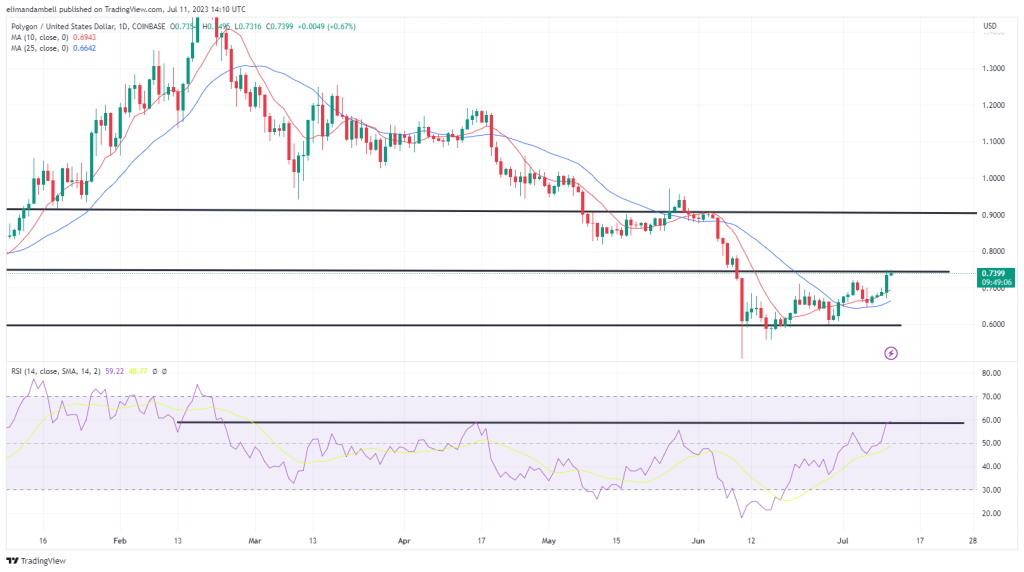 As a result of this surge, MATIC hit its highest point since June 9, which is the last time the token broke out of a ceiling at $0.7480.