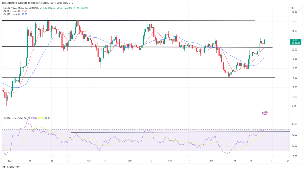 Should today’s momentum extend throughout the week, there is a good chance that solana will climb past $23.00.