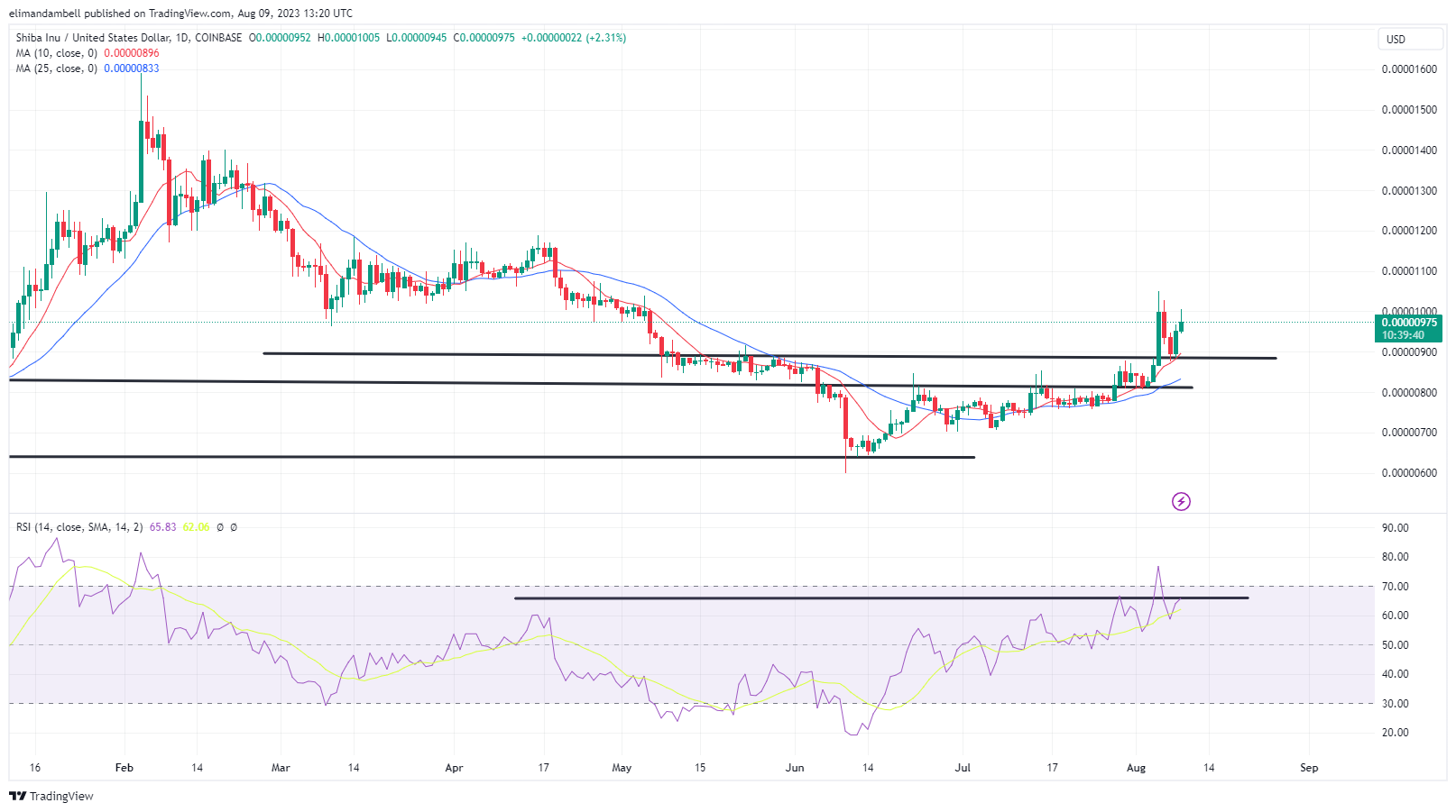 Following a low of $0.000009027 on Tuesday, SHIB/USD rallied to an intraday peak at $0.00001002 earlier in today’s session.