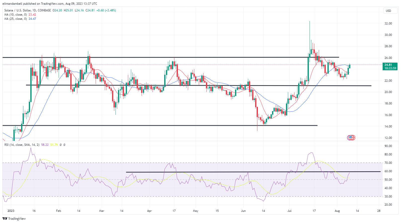 SOL/USD jumped to a high of $24.91 on Wednesday, a day after falling to a bottom at the $23.21 level.