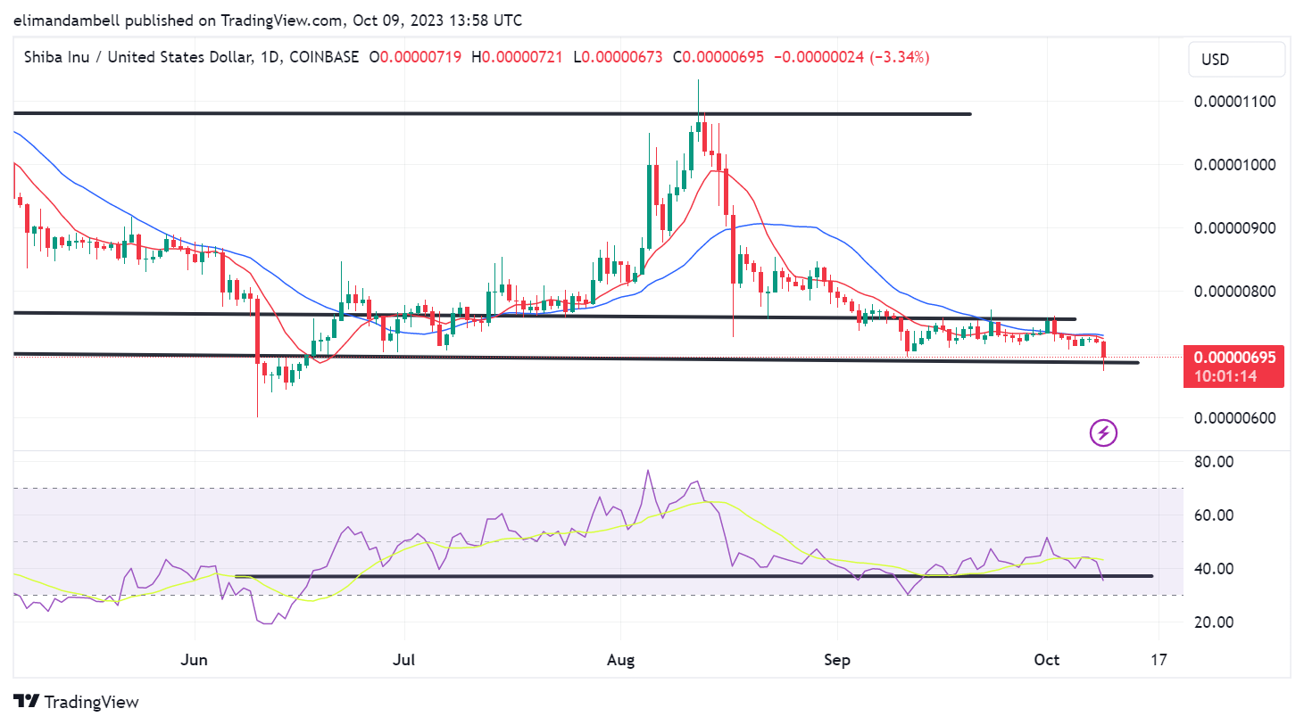 Should it drop below this point, SHIB will enter the oversold zone, which could then prompt bulls to potentially buy the dip.