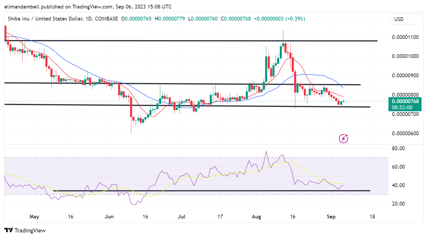 Price rallied to a peak of $0.000007757 earlier in the day, which comes after Tuesday’s low at $0.0000076.