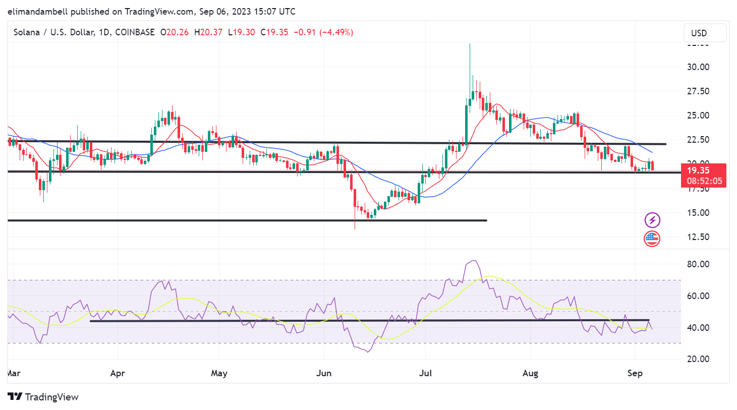 The decline sees solana now on the cusp of colliding with a support point at the $19.00 mark, which has been the floor for the past two months.