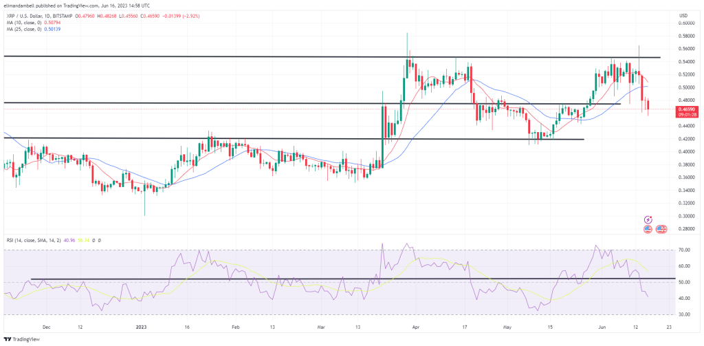 XRP/USD plunged to an intraday low of $0.4601 on Friday, a day after trading at a peak of $0.4833.