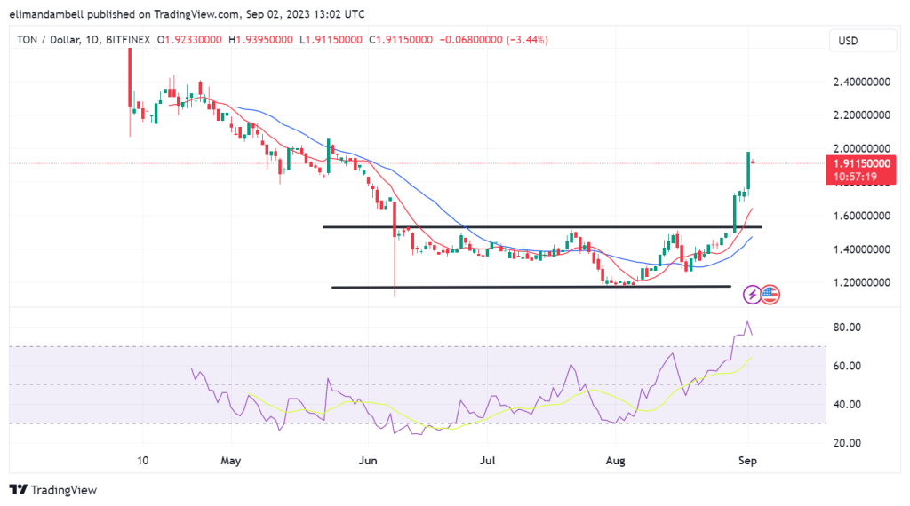 After a low of $1.74 on Friday, TON/USD surged to an intraday peak of $1.95 to start the weekend.