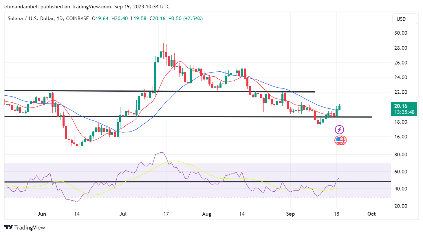 Following a low of $19.51 to start the week, SOL/USD has risen to a high of $20.36 earlier in today’s session.