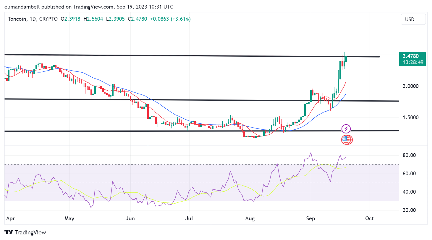 TON/USD peaked at $2.51 earlier in the day, which comes less than 24 hours after tracking at a low of $2.39.