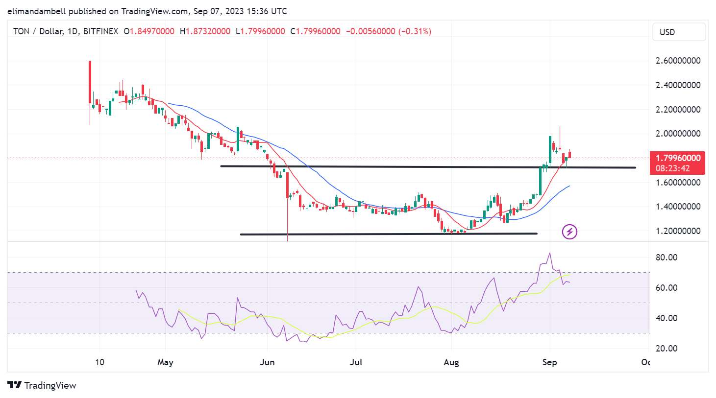 Following a low of $1.75 on Wednesday, TON/USD rose to a peak of $1.88, earlier in todayโs session.