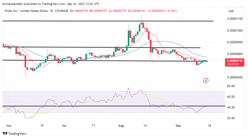 Earlier gains have since faded, with SHIB now tracking at $0.000007425, which comes as the RSI collided with a hurdle.