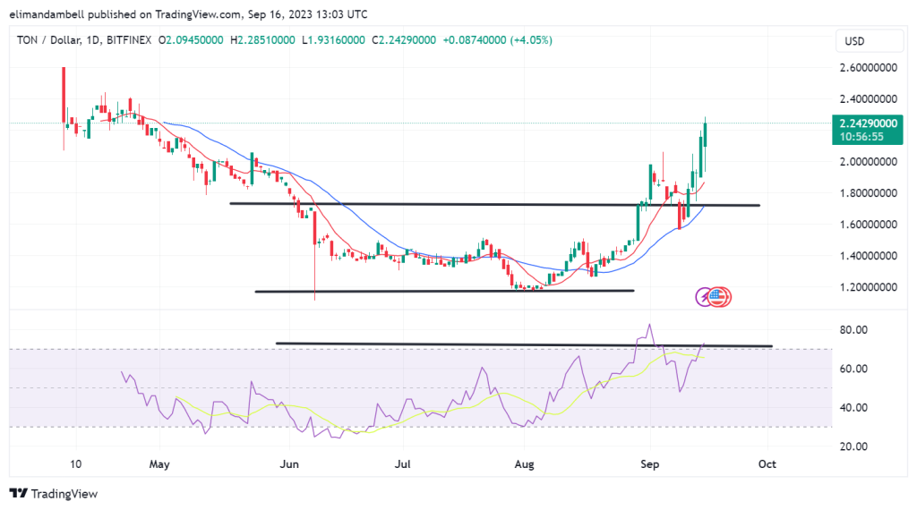 Following a low of $1.94 on Saturday, TON/USD raced to an intraday high of $2.23 to start the weekend.