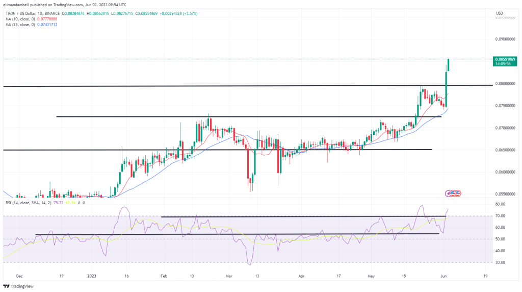Overall, tron is up 12.16% in the last seven days, with the latest rally leading to a breakout of a ceiling at $0.0796
