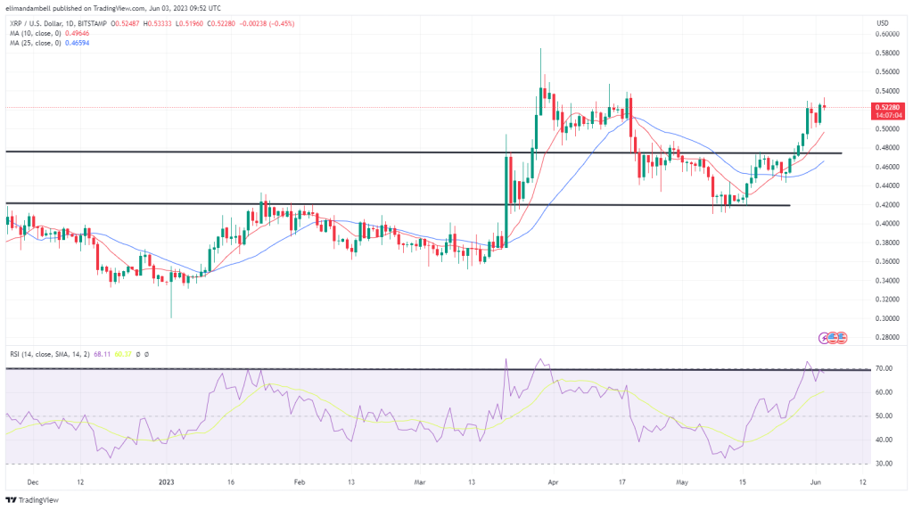 This move led to the token nearing a collision with a resistance level at $0.5300, securing its highest point since April 19 in the process.