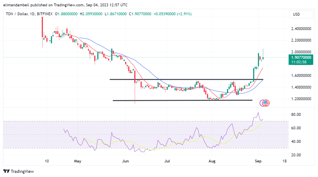 As a result of the move, toncoin climbed to its strongest point since May 8, when the price reached a high of $2.08.