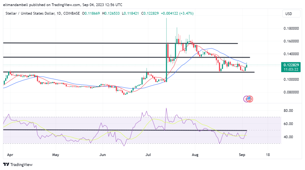 This surge sees stellar climb higher for a second consecutive day, following a rebound from a floor at $0.110.