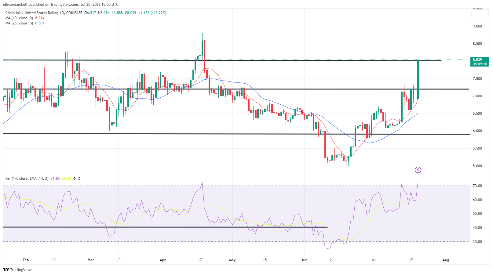 After falling to a low of $6.88 on Wednesday, LINK/USD rallied to an intraday peak of $8.32 earlier in the day.