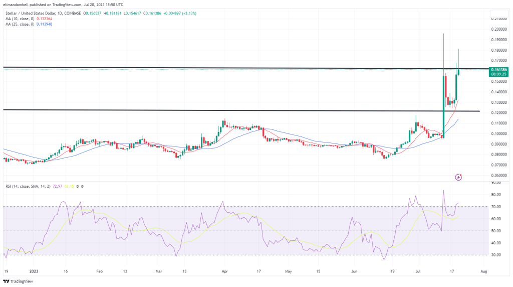 Similar to chainlink, this peak pushed stellar to its highest point since last Thursday, when the token hit a then 15-month high.