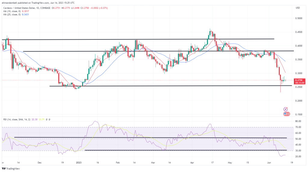 Following a high of $0.2895 on Tuesday, ADA/USD dropped to an intraday low of $0.2699 today.