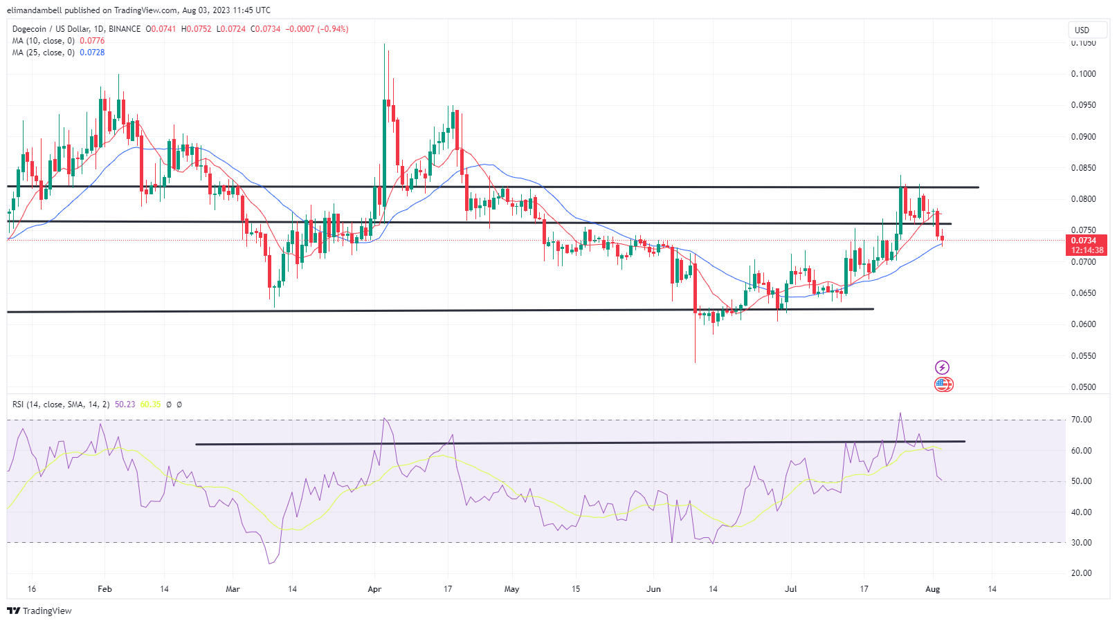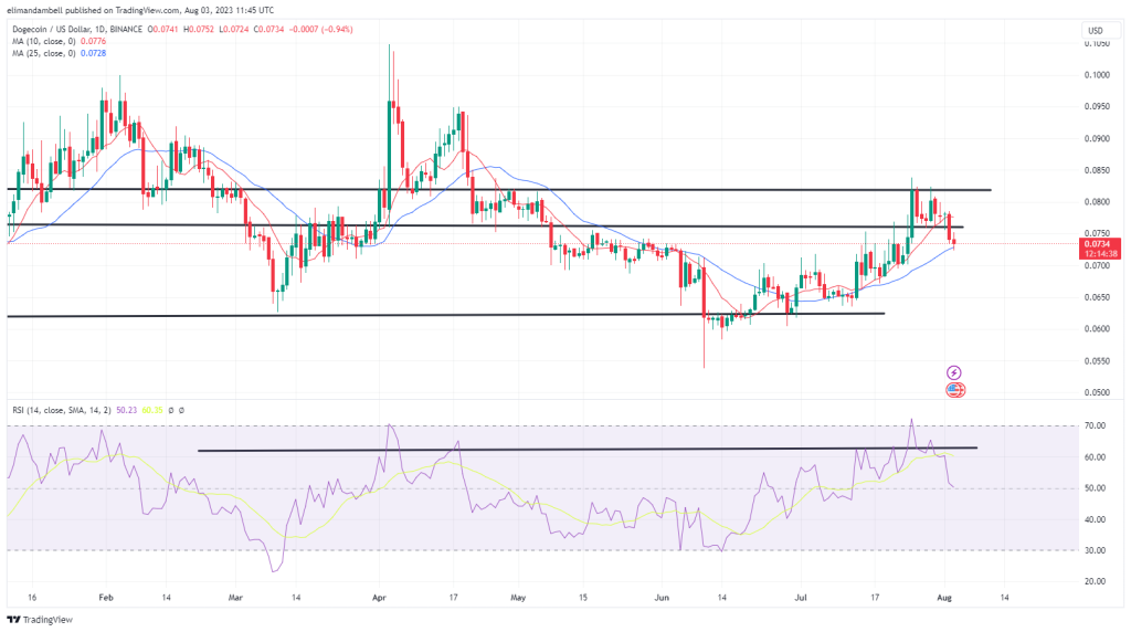 The RSI is currently at a reading of 50.23, with DOGE trading at $0.07339, which is marginally above today’s bottom.