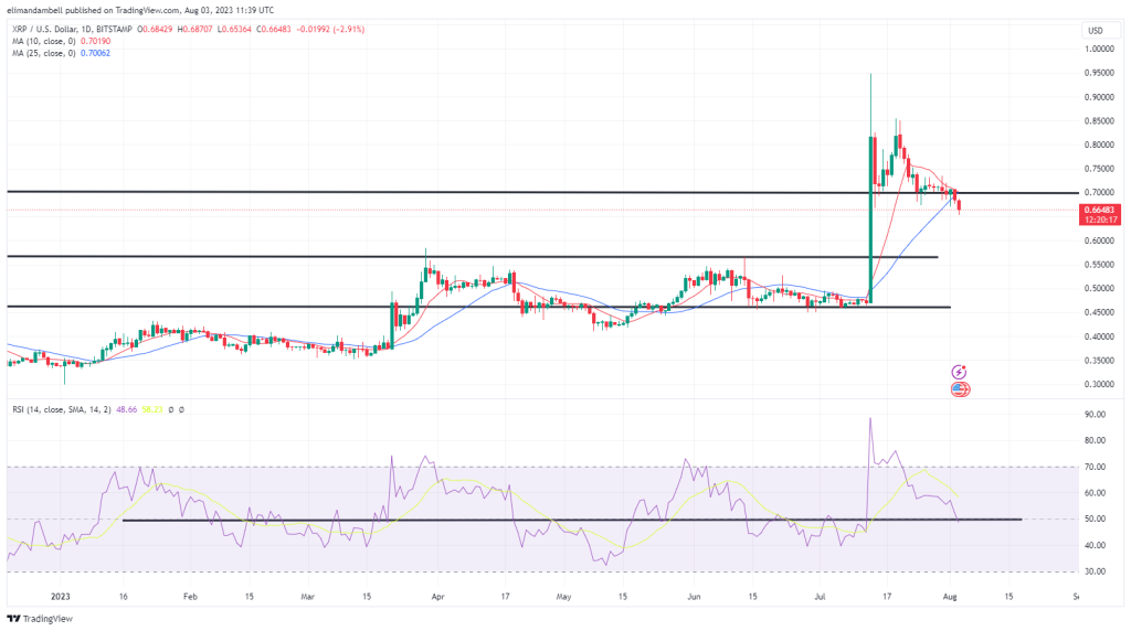 Following a high of $0.6971 the day prior, XRP/USD slipped to an intraday low of $0.6589 earlier in the day.