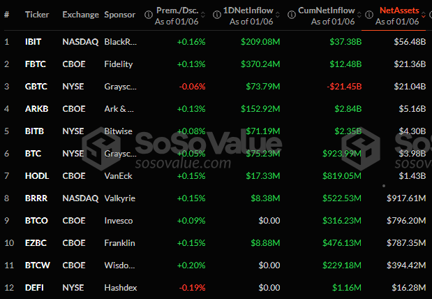 U.S. spot bitcoin and ether exchange-traded funds (ETFs) continued their strong start to the year with a combined inflow of $1.1 billion on Monday, Jan. 6.