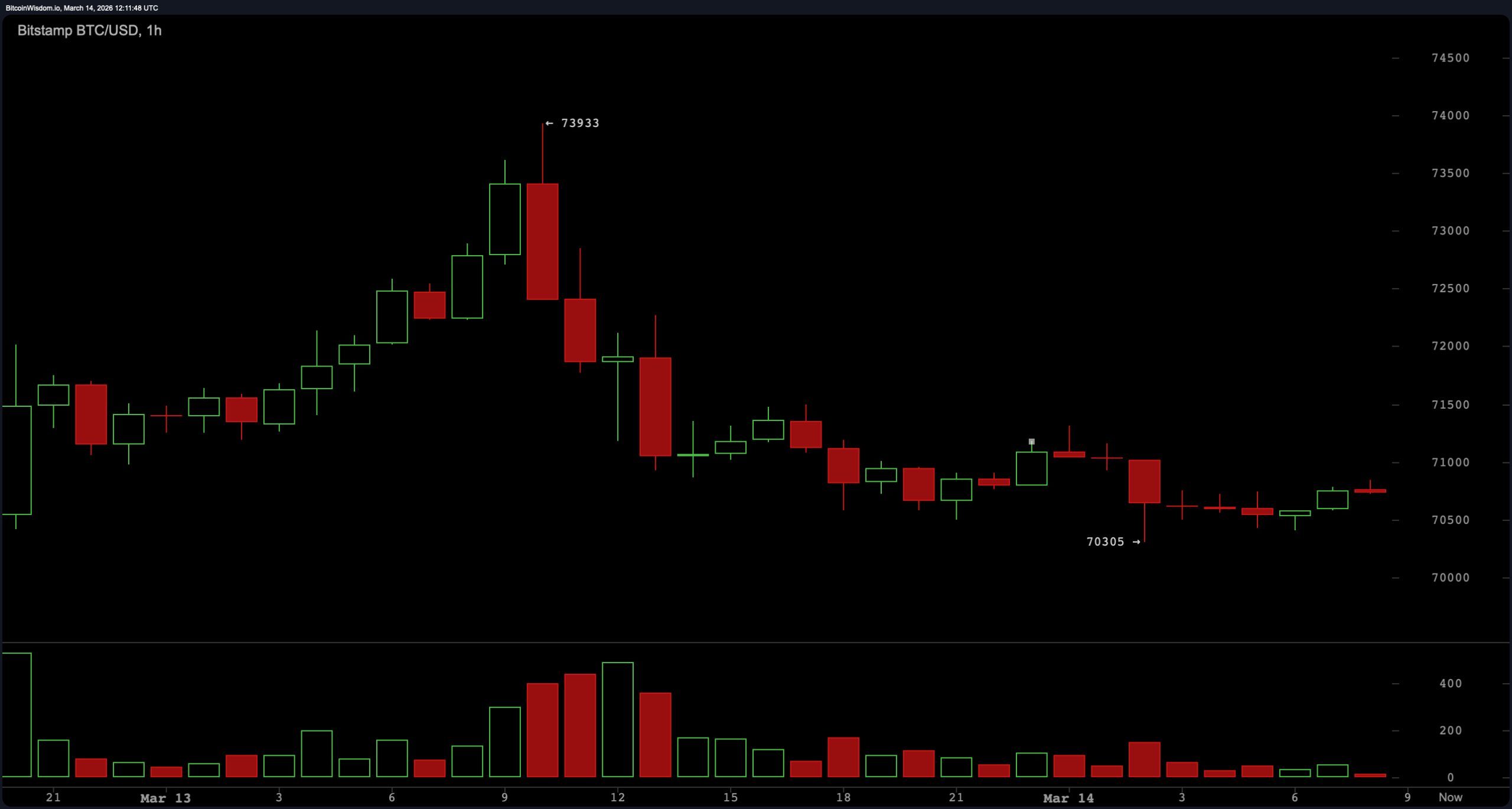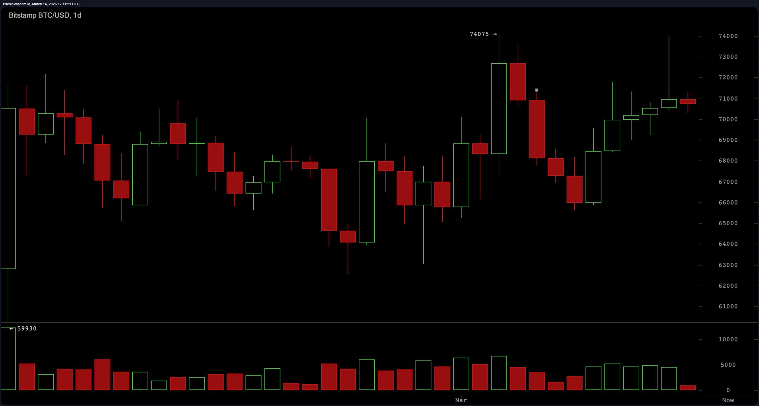 Bitcoin traded at $70,795 on March 14, 2026, with a market capitalization of $1.41 trillion and 24-hour trading volume of $49.48 billion. The cryptocurrency moved within an intraday range between $70,416 and $73,838 while technical indicators across major timeframes reflected a neutral market structure.