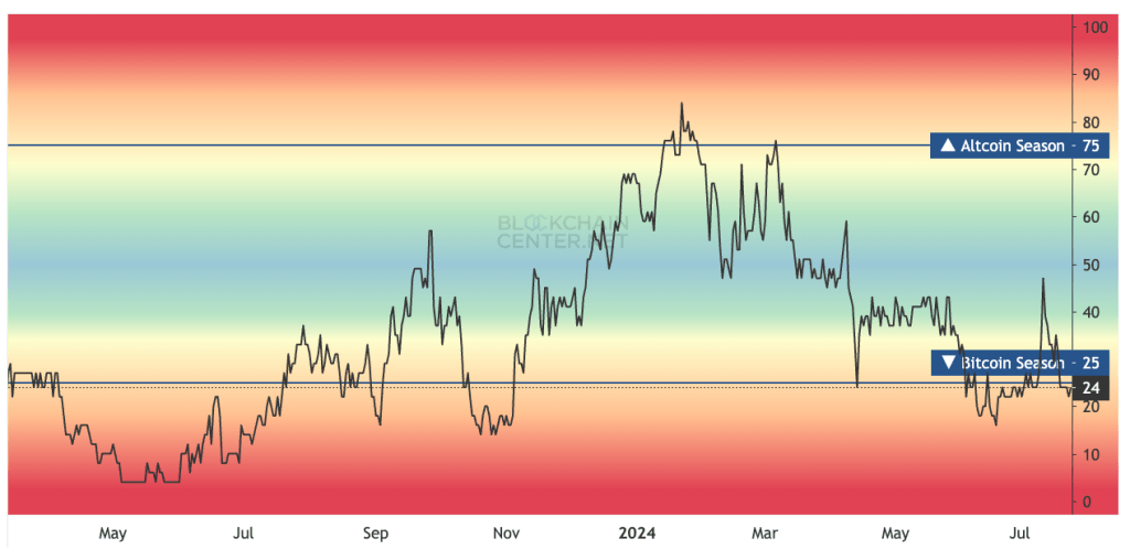 In mid-July, the Altcoin Season Index (ASI) available on blockchaincenter.net began to rise, reaching a high of 46 and nearing the significant threshold of 75. Since then, however, the ASI score has dropped to 24, indicating that a period of increased gains for alternative cryptocurrencies is now more distant.