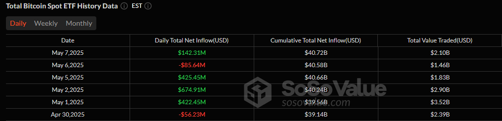 The bulls returned to bitcoin ETFs midweek, pushing aside Tuesday’s slip with $142.31 million in net inflows. Capital flooded into four key funds, with Ark 21shares’ ARKB taking the lead at $54.73 million, followed by Fidelity’s FBTC with $39.92 million, and Blackrock’s IBIT, which added $37.19 million. Bitwise’s BITB rounded out the day with a modest $10.48 million inflow. No fund recorded outflows, a rare all-green showing.
