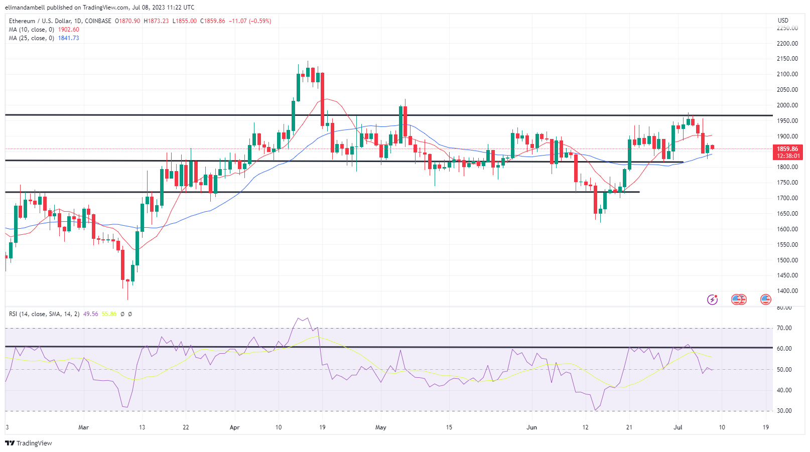 Since hitting a peak at $1,957 on Thursday, ETH/USD has failed to trade above $1,900, with today’s drop taking price to a low of $1,854.92.