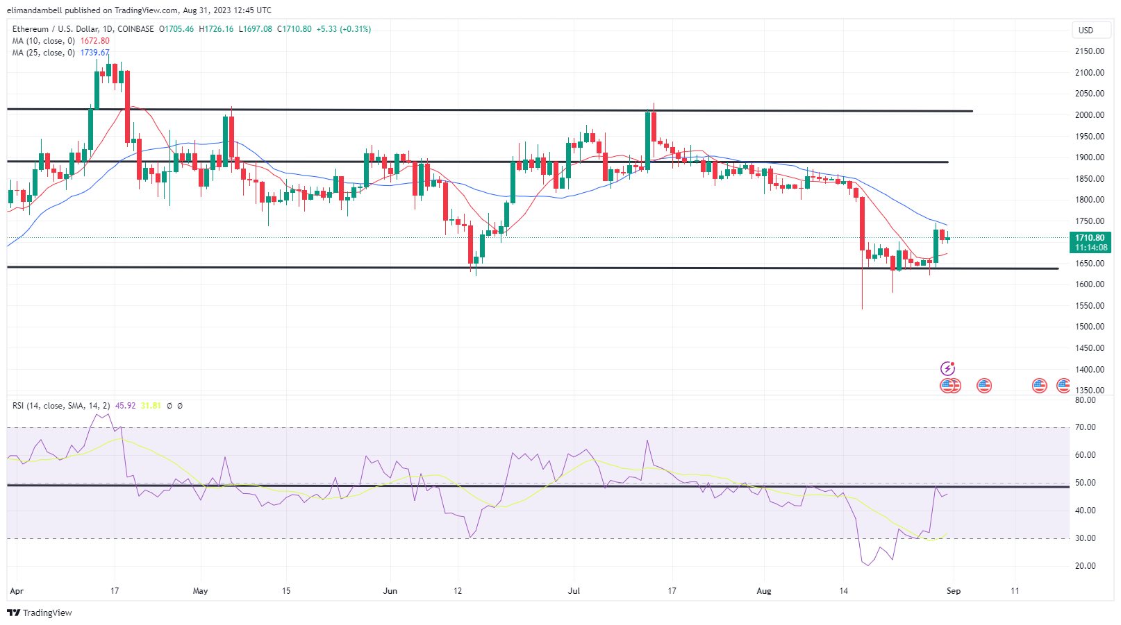 ETH/USD dropped to the bottom of $1,697.15 earlier in the day, which comes following a high of $1,721.62 the day prior.