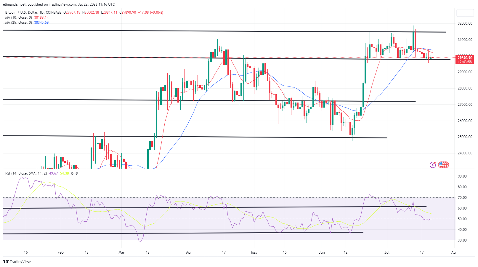 BTC/USD rose to an intraday high of $30,046.00, which comes following an earlier low of $29,746.12.