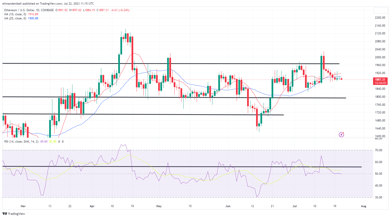 Ethereum was also consolidating during today’s session, as the cryptocurrency remained below $1,900.