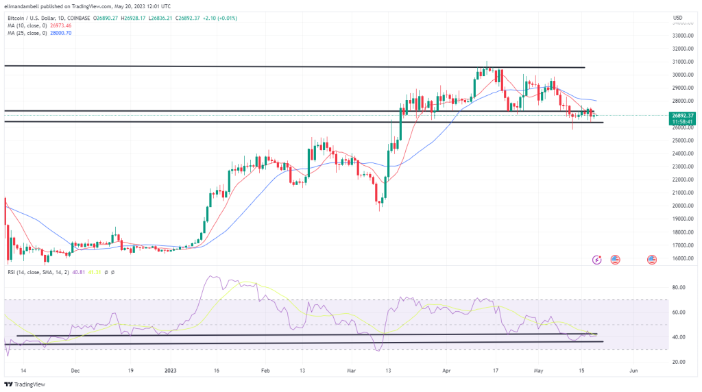 The move sees bitcoin remain relatively close to a floor at $26,300, and comes despite optimism that the Fed could soon begin to ease monetary policy.