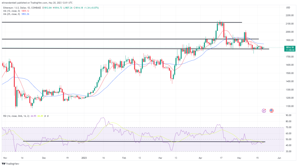 ETH/USD hit a high of $1,826.19 earlier in the day, which comes less than 24 hours after nearly dropping below $1,800.