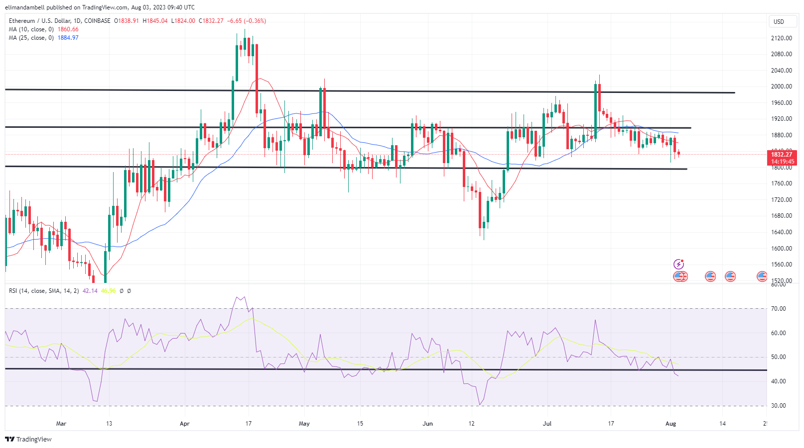 As a result of today’s decline, ethereum moved back towards a four-week low at $1,812.